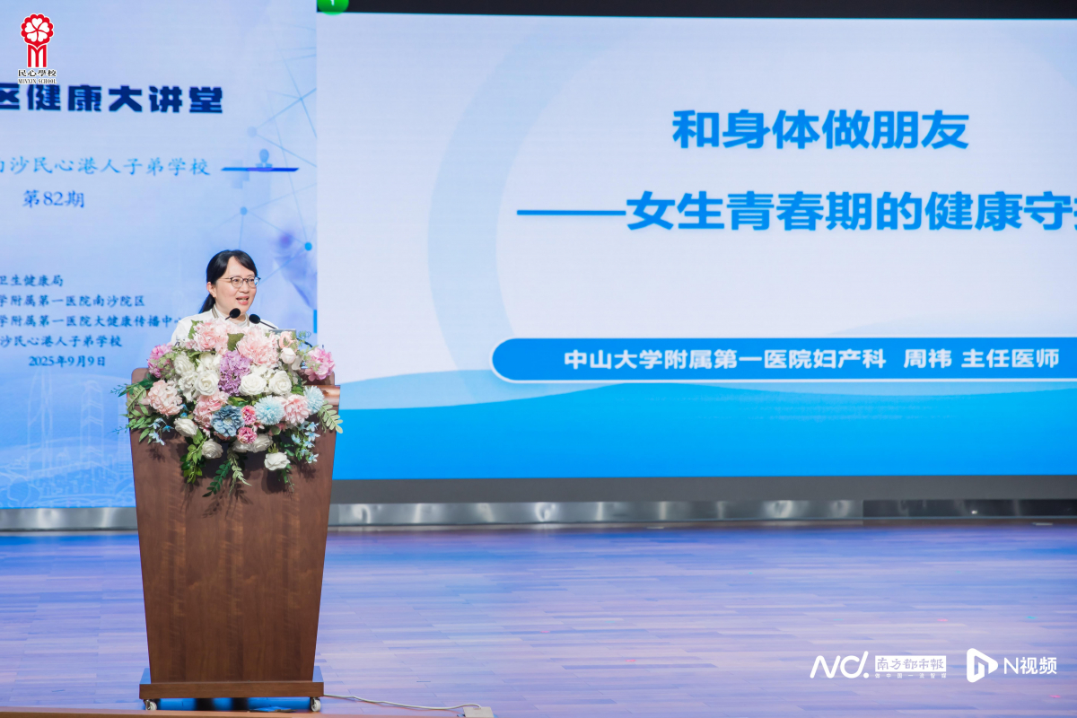中山一院产科副主任、南沙院区产科执行主任周祎带来了《和身体做朋友:女生青春期的健康守护》的专题讲座。系统讲解了女性青春期的生理、心理变化特征,阐释了月经的成因、周期规律及常见问题应对方式。医生强调,青春期月经不规律属正常现象,但若持续4个月以上闭经需及时就医。课程还科普了HPV与艾滋病防治知识,指出9-14岁为HPV疫苗最佳接种期,呼吁学生通过接种疫苗、避免高危行为等方式做好自我保护。